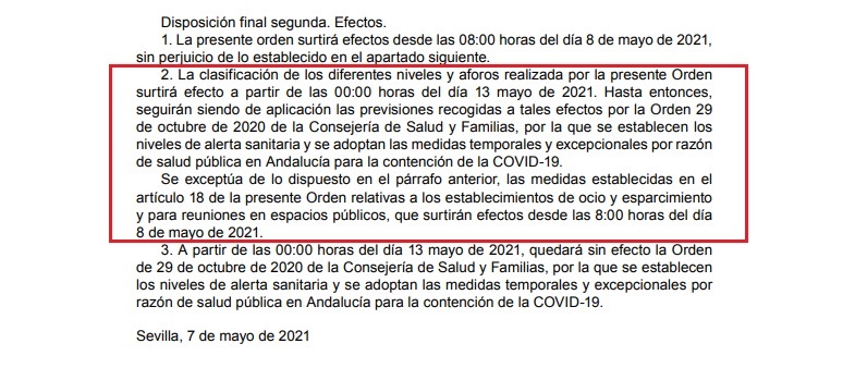 La orden está ya en vigor. Pero, como explica en la disposición final segunda, la clasificación de los diferentes niveles y aforos que se detalla en su texto no surtirá efecto hasta las 00.00 horas del próximo 13 de mayo. Establece no obstante una excepción, para los establecimientos de ocio y esparcimiento recogidos en el artículo 18, que son, entre otros, aquellos clasificados como discotecas o salas de fiesta, así como los locales de hostelería con música, además de las reuniones en espacios públicos. Para todos estos sí será de aplicación desde este mismo fin de semana.