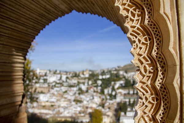 Precioso detalle de la decoración de la Alhambra, con el Albaicín difuminado al fondo. Fotografía: Alba Feixas