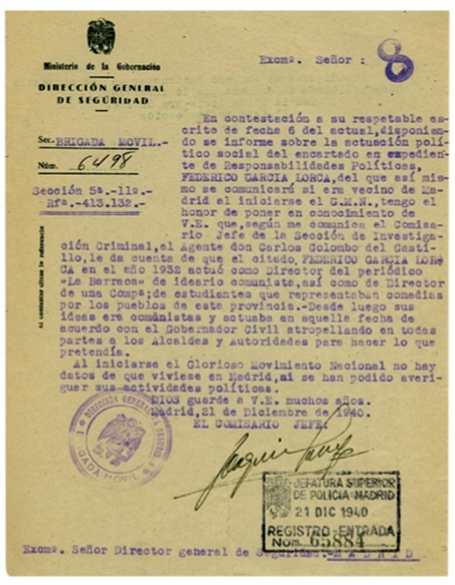 Va en la línea de otro informe policial muy posterior, de julio de 1965, que fue conocido en 2016, al difundirlo la Cadena SER. En la línea de los informes franquistas, como se ha indicado. En el caso de los documentos que ahora se pueden contemplar en el Centro Lorca, recogen un intercambio de escritos. Unos solicitando información y otros respondiendo en el contexto del expediente de responsabilidades políticas. El Juzgado de Responsabilidades Políticas de Granada solicita a la Dirección General de Seguridad citada aclaración sobre si Federico García Lorca "era vecino de Madrid" al iniciarse el golpe militar, que el documento refiere como "glorioso movimiento nacional" y también un informe sobre su "actuación política social".