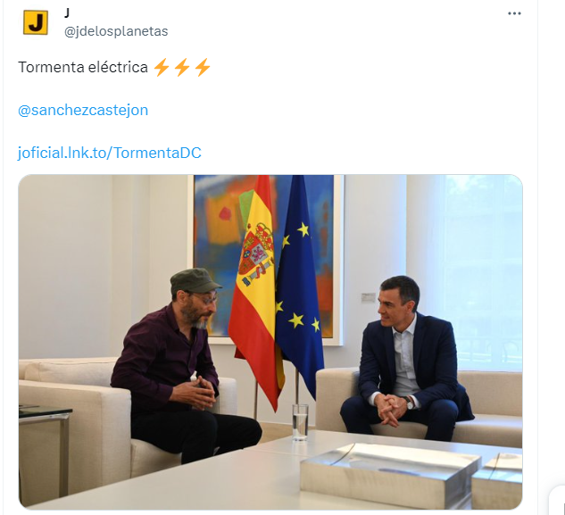 La imagen corresponde a un encuentro del músico con el presidente del Gobierno tras cumplirse el 25 aniversario de un trabajo icónico, 'Una semana en el motor del autobús'. Ya entonces Pedro Sánchez felicitó a la banda granadina también a través de redes sociales: "Hoy se cumplen 25 años de esta obra de arte que marcó una época. Muchas gracias a Los Planetas por acompañarme en tantos momentos a lo largo de mi vida. ¡Felicidades!"