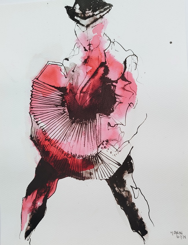 Miguel Carini es un poeta de la imagen, pues plasma el verso sentido en su obra plástica. Este artista siempre sorprende, pues supera el trabajo anterior para ofrecer nuevas propuestas de extenso peso estético. Simula el ritmo lírico provocado por el poema, en sus líneas sinuosas, en las imágenes evocadoras, en miradas cadenciosas, expectantes, recelosas, anhelantes… apoyado en una conjugación cromática impresa, con la que reproduce sensaciones agudas, encadenadas con aquellas graves, cuando el color es pasional, intenso, pasando a la evanescencia tonal abierta, clara, feliz, optimista. Incorpora Carini ráfagas de cromatismo elegante, impregnados de frescura visual, flotando sobre los campos del ensueño, cuando navega entre el oleaje apasionado del tango. Esa es la gracia compositiva de este genial artista, al mostrar un trabajo de poderoso efecto sensitivo.
