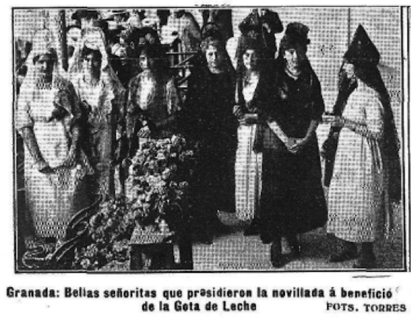 La prensa madrileña solía hacerse eco de las corridas benéficas de las señoras pudientes granadinas, de sus rifas y de sorteos de Scouts para buscar dinero destinado a la Gota de Leche. Estas fotos pertenecen a Mundo Gráfico y La Unión Ilustrada de los años 1916 a 1918.