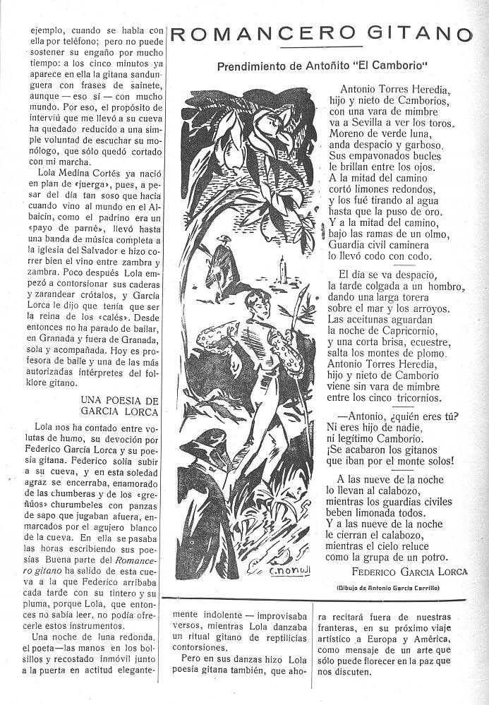 [Aprovecho para recordar la anécdota de que Gracia Sacromonte conoció el primer poema de Federico García Lorca en 1952. De manera misteriosa y sin que la censura se percatara de ello, la revista Granada Gráfica de mayo de 1952 publicó el poema Prendimiento de Antonito el Camborio, con una ilustración en la que se veían guardias civiles, dentro de un extenso reportaje sobre los gitanos granadinos. Gracia Sacromonte siempre llevó aquella página en su maleta].
