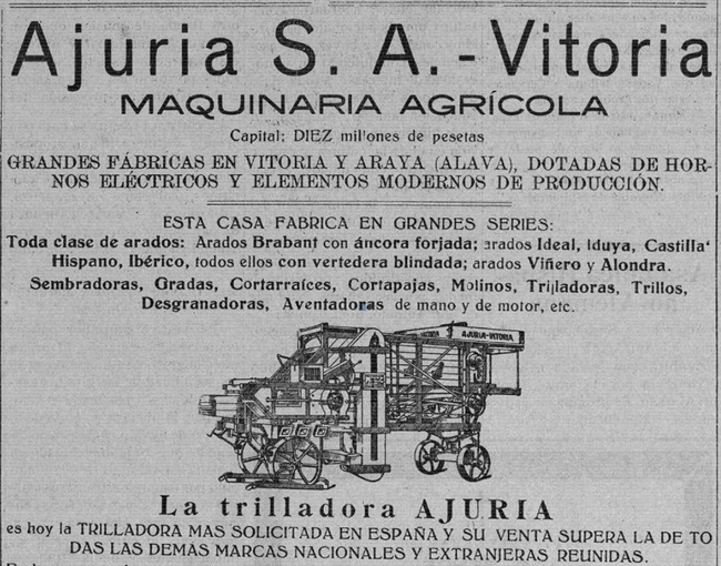 Pero si Federico Hita fue innovador con la almazara, no lo fue menos con los cereales. En los años treinta, probablemente, también compró una trilladora de la casa Ajuria, S.A, que se fabricaba en Vitoria y Álava (Gasteiz). Esa máquina se alimentaba a mano. La mies pasaba por un cilindro desgranador y disponía de cuatro sacudidores que separaban el grano de la paja larga y transportaban ésta al cilindro machacador de donde la paja salía cortada y magullada en condiciones de servir de alimento al ganado. Este modelo era capaz de producir 5 toneladas de trigo por jornada de trabajo. Y, de nuevo, innovador porque, y hasta mucho tiempo más tarde, se siguió segando a mano y aventando las mieses en las eras. Claro que todo se concebía desde el prisma de obtener más beneficio, pero no todos los empresarios invertían sus beneficios en procesos industriales.