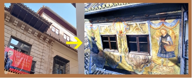 La más escondida la encontramos en el torreón de la Casa de los Pisa, por la estrechez de la calle y la altura a la que se encuentra. Pero merece la pena buscarla porque es una de las más interesantes. Las pequeñas ventanas están realzadas por abajo con una especie de pedestales y adornos florales en su alrededor, todo en vivos colores. Entre ambos huecos pintaron el emblema de la Orden Hospitalaria, la cruz naciendo de una granada (“Granada será tu cruz”). En el paño de la izquierda aparece un San Juan de Dios arrodillado, sujetando una cruz; en el de la derecha es un ángel alado el que, con una cesta de panes, ofrece alimento a los pobres.