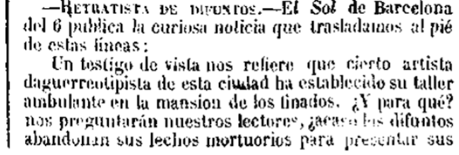 Noticia de 1852 que ya informa sobre un fotógrafo que circulaba por Barcelona retratando cadáveres para “inmortalizarlos”.