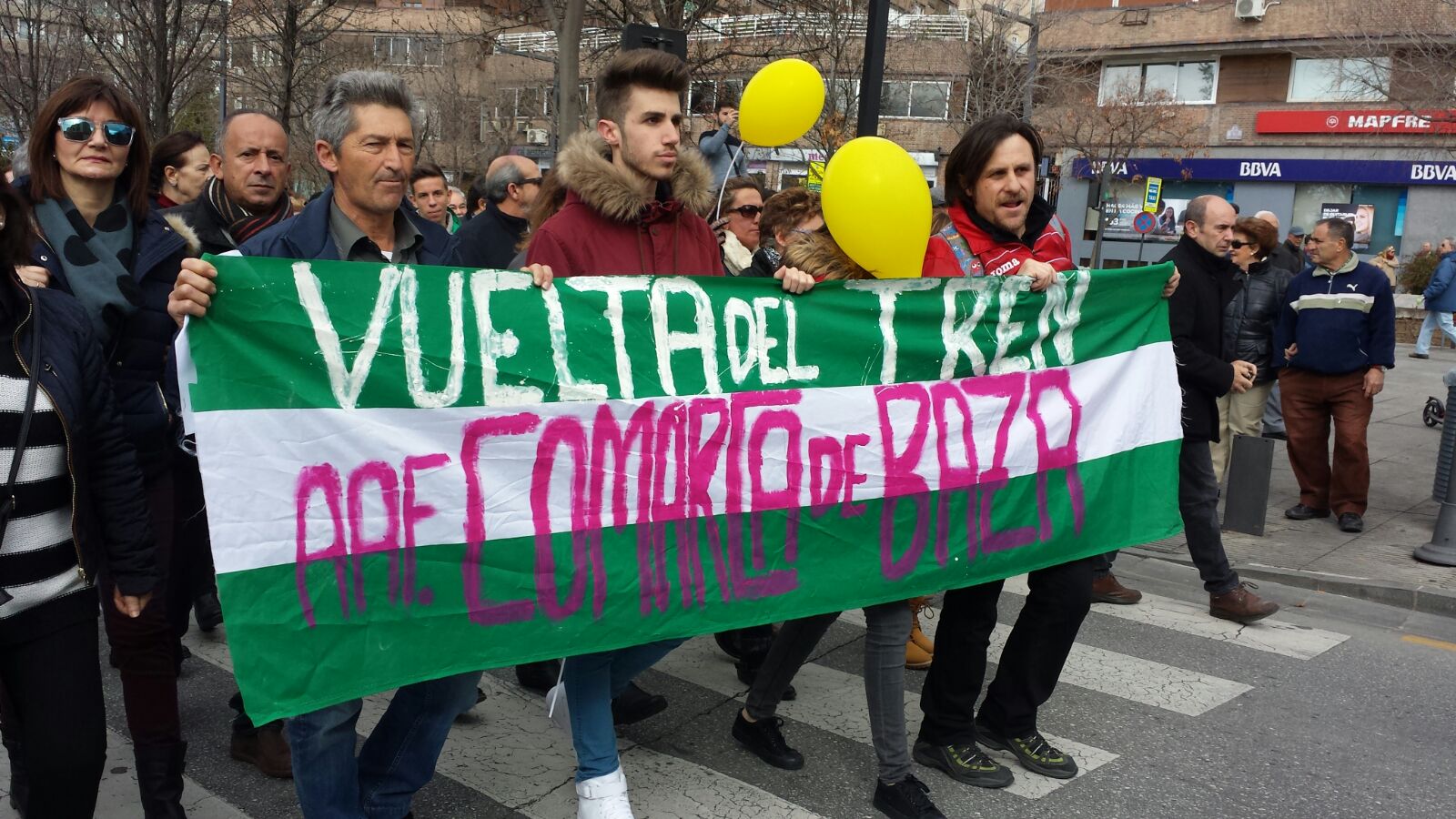 ‘Ahora el tren’ 'Se trata de Granada', señala la pancarta que abría la manifestación, que ha partido pasado el mediodía desde la estación de RENFE, donde con sorna hay una exposición fotográfica sobre el tren, y en cuya plaza, rodeada de vallas, salen los autobuses con dirección a la estación de Santa Ana, en Antequera, para que pasajeros se conecten desde Málaga a la Alta Velocidad.