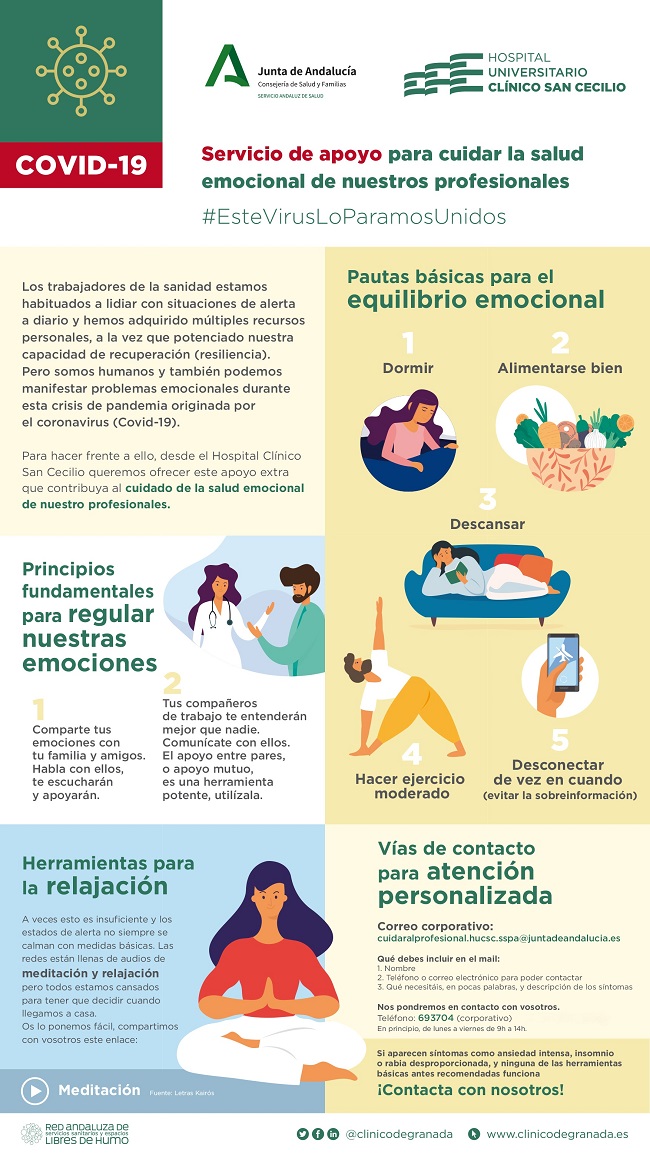El Hospital Universitario Clínico San Cecilio de Granada, ubicado en el Parque Tecnológico de la Salud (PTS), pone en marcha esta misma semana un servicio de atención psicológica dirigido a los profesionales del centro para cuidar su salud emocional. Con este objetivo, la Unidad de Salud Mental del hospital ha habilitado un teléfono y un correo corporativo específico para prestar apoyo a los profesionales que lo requieran y que se enfrentan a situaciones de estrés o sobrecarga asistencial derivadas de la pandemia por coronavirus (Covid-19).