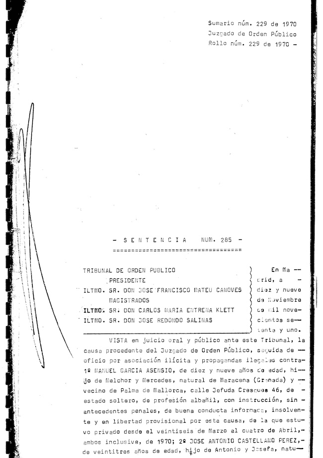Extracto de la sentencia contra las CCOO Juveniles de Granada , Sumario 229/70, Sentencia 285 del 19 de noviembre de 1971. (Sentencias en Archivo Histórico de CCOO de Andalucía).