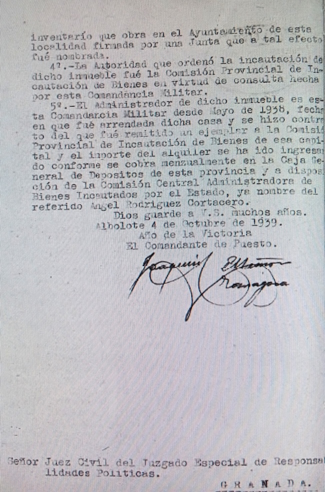 Reseña en El Defensor de Granada, 8 de octubre de 1933,RODRÍGUEZ RAMÍREZ, Carmen. Nace en 1915 en Albolote (Granada), donde reside. Casada con Ángel Rodríguez Cortacero, con una hija. Es una de las represaliadas en Granada que fueron sancionadas por la Comisión Provincial de Responsabilidades Políticas y/o la Comisión Provincial de Incautación de Bienes, derivado de sus responsabilidades políticas, 1936-1945. (Véase Incautación de bienes). El 19 de abril de 1939, según el Juez de Responsabilidades Políticas, “al estallar el Glorioso Movimiento Nacional se encontraba con su esposo trabajando en faenas agrícolas en el Cortijo del Marqués de este término municipal, siéndoles imposible pasarse a zona nacional habiendo permanecido en Iznalloz a donde le obligaron los marxistas a marchar con su esposo e hija; que de dicho pueblo se llevaron a su esposo creyendo se lo llevarían a Barcelona, no teniendo noticias suyas desde hace dos años por lo que cree haya fallecido, pero la recurrente nada ha hecho que pueda considerarse como desafección al régimen de la España Nacional. Que al terminar la guerra y para regresar a esta localidad se ha encontrado con que una pequeña casa propiedad de su esposo fue intervenida por la Guardia Civil y arrendada a un vecino de esta localidad encontrándose sin casa a donde poder albergarse con su pequeña hija y faltándole recursos de toda clase, por lo cual suplica se digne le sea devuelta la referida casa para ocuparla con su hija”. El 4 de octubre de 1939, y según la Guardia Civil, “la conducta de la encartada anterior al Glorioso Movimiento Nacional fue regular y sus ideas políticas marxistas, aunque no consta que estuviera afilada a ningún partido ni sindicato. Huyó al campo rojo con su esposo, el cual falleció, parece ser que en el Ebro y ella residió en el pueblo de Iznalloz hasta la terminación de la guerra. Fue incautada la casa de su propiedad. El administrador de dicho inmueble es el Comandante Militar desde mayo de 1938, fecha en que fue arrendada dicha casa”. Con fecha de 14 de octubre de 1939 según la Guardia Civil “la casa la heredaron los padres de ambos y fue valorada en 1900 pesetas y al hacer las particiones de los bienes heredados en un juicio de conciliación celebrado ante el Juez Municipal, acordaron que en dicha valoración le pertenecía a la citada María Rodríguez 1200 pesetas y 700 a su hermano Ángel Rodríguez bajo la condición de que el primero que abonara al otro era la casa para él, pero como hasta la fecha no ha abonado ninguno, pues sigue dicho inmueble en iguales condiciones). Desconocemos en que se sustanció dicho expediente. (Archivo Real Chancillería de Granada, Caja 25823, Pieza 12).