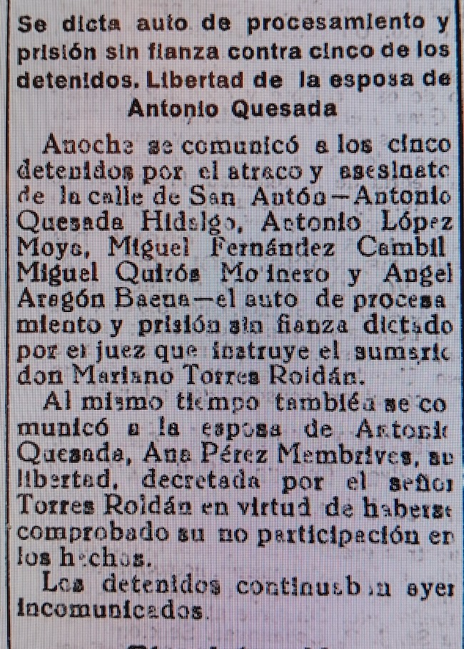 Monumento a los vecinos de Albolote, en el Paseo Colón, que rinde homenaje a los que murieron en los campos de concentración nazis. (Foto internet).LÓPEZ MOYA, Antonio. Nace en 1910 en Albolote (Granada) y vecino de Granada (Granada), con domicilio en calle Hornillo, 29. Soltero, trabajador de la azucarera La Purísima Concepción. Hijo de José y Francisca. Militante de la CNT. Según Fernández Andújar, “de la construcción, acusado de atracador, del sector duro del anarquismo” (FERNÁNDEZ ANDÚJAR, mayo 2021). Con motivo de la Huelga General convocada por la CNT desde el 12 al 17 de octubre de 1931, hubo numerosas detenciones y enfrentamientos –incluso armados- entre manifestantes y fuerza pública, con heridos de bala. Uno de los gremios que siguió la huelga fue el de chóferes. El día 15 de octubre fueron detenidos cuatro de ellos: Antonio López Moral, Antonio López Moya, Antonio Machado Fernández y Manuel Fernández Ariza, lo que provocó una nota de protesta de su sindicato y la amenaza de seguir con la huelga en tanto estuvieran presos. Todos ellos fueron llevados a la prisión militar de Torres Bermejas. (El Defensor de Granada, 16 y 17 de octubre de 1931). Aparece en el sumario de un grupo de chóferes que fueron acusados de mantener una reunión en el Llano de la Perdiz, en el contexto de la huelga general –declarada ilegal- que había sido convocada el día 12 de octubre de 1931 por la CNT. A todos ellos se les abre proceso judicial por “Reunión ilícita”. El 23 de octubre de 1931, la Comisaría de Investigación y Vigilancia de Granada, afirma que según la información facilitada por la Guardia Civil, la reunión ilegal del Llano de la Perdiz –celebrada el 14 de octubre- podría haber sido organizada por Antonio Machado Fernández, Manuel Fernández Ariza, Antonio López Moya, Francisco Guirado Rodríguez, José Martos García, Antonio López del Moral y Francisco Galadí Melgar. (Causa 418/31). El día 12 de mayo de 1933, por orden gubernativa, se detiene a veinte dirigentes de la CNT –muchos reincidentes y fichados por la policía-, precisamente cuando ya había acabado la Huelga General de dos días que había iniciado el 9 de ese mismo mes para protestar por la persecución de que era objeto la organización anarcosindicalista. Los detenidos, y a disposición de la autoridad judicial, no lo eran por su actuación durante la huelga, sino solo por el mero hecho de ser dirigentes de la CNT. (Véase relación completa de detenidos en Francisco Burgos Serrano). Los detenidos fueron, entre otros, Antonio López, Julián Noguera del Río, José Robles Guzmán, Evaristo Torralba García, José Alcántara García, Miguel Robles Fernández, Antonio Quesada Hidalgo o Benito Pabón, el abogado anarquista, que se presentó en comisaría y quedó detenido. Todos ellos pasaron a la prisión provincial. (El Defensor de Granada, 13 de mayo de 1933). A lo largo de ese mes, diversos artefactos explosivos explotarán en diversos lugares de Granada. La policía irá deteniendo a militantes anarquistas en esos días. La policía irá estrechando el círculo hasta que encuentra a los militantes y el lugar donde se fabricaban dichos artefactos. (Véase Antonio Cañete Rodríguez). (El Defensor de Granada del 26 al 30 de mayo de 1933). El día 4 de octubre de 1933 se produce un intento de atraco en la Tabacalera con un tiroteo que produce un muerto –el cajero de la Tabacalera-. A raíz de las pesquisas policiales se producirán varias detenciones en los días siguientes, de forma que el día 5 de octubre –después de dejar en libertad a quienes nada tenían que ver con el hecho-, serán cinco los que –a juicio de la policía- se han confesado autores del asesinato, siendo Antonio López uno de ellos. Serán encarcelados, incomunicados, y sin fianza. (Véase el desarrollo de los acontecimientos y la lista de detenidos en Antonio Quesada Hidalgo). (El Defensor de Granada, 4 al 8 de octubre de 1933).