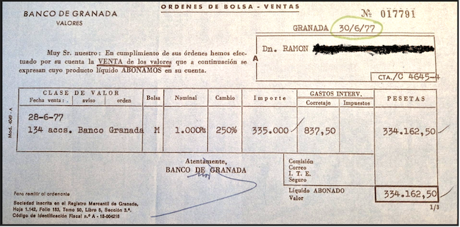 La revalorización y la liquidez eran altísimas. Había euforia en torno a ellas. Traigo el ejemplo de este paquete de 134 acciones (134.000 pesetas) de un pequeño ahorrador granadino. Las había adquirido en los primeros años, por ese mismo coste; necesitó comprar un piso en 1977, para lo cual las puso en venta el 28 de junio y se las quitaron de las manos al día siguiente. Su inversión inicial de 134.000 pesetas se había multiplicado por 2,5 veces hasta venderlas pocos años después por 335.000 pesetas. Es el mejor ejemplo del negocio especulador que rodeó el mercado de acciones del Banco de Granada, y de bancos similares. El que supo comprar y vender a tiempo ganó bastante dinero.