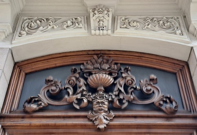 Para redundar más en la figura de Giménez Arévalo en ésta su primera casa de la Gran Vía, sobre el dintel de la puerta principal se repite otro mascarón vaciado en yeso que vuelve a reproducir el mismo bigote del amo del lugar.