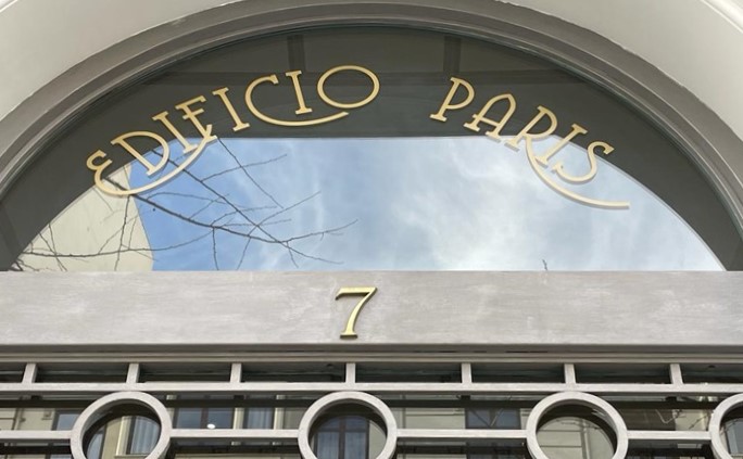 7. De Hotel París a Edificio París. Nicolás García Ruiz adquirió el solar lindero con la Sacristía de la Catedral para destinarlo a hotel. Se llamó París desde el principio, cuando abrió sus puertas en 1907. Lo identificó con su nombre impreso en la cristalera de la puerta principal. También tuvo grabado el nombre de Hotel París en las cristaleras que daban al hall de entrada y el comedor con vistas a la calle. En un cornero de las cristaleras estuvieron inscritas las iniciales de Nicolas García.