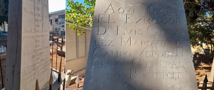 El VII Marqués de Campo Verde y la VIII Marquesa continuaron residiendo en Granada, como lo habían hecho sus antepasados desde que llegó su ancestro como corregidor de Granada, el III Marqués (Luis González Torres de Navarra); aquel hombre fue uno de los corregidores más longevos de la ciudad, ya que ejerció entre 1742 y 1763 y echó raíces en Granada y su entorno. El VI Marqués fue enterrado en el Cementerio de las Barreras (actual San José) el 21 de julio de 1832; en principio, su tumba fue sobre tierra, muy modesta. Medio siglo después, en 1883, el cementerio estaba tomando auge con abundantes y artísticos panteones familiares de pudientes. La sepultura está situada en la cuarta fila del Patio Primero, número 39. En 1883, la VIII Marquesa (Jacoba González de Aguilar-Torres de Navarra y de la Cerda) decidió pagarle a su abuelo un panteón más digno; sobre su solar de enterramiento levantaron un modesto obelisco, rodeado por una verja de forja; en las cuatro caras del obelisco figuran los datos básicos y los méritos en vida del único enterrado en ese panteón: “Aquí yace el Excmo. Señor D. Luis González, Marqués de Campo Verde. Teniente General de los Exércitos. La fortuna lo halló modesto, la adversidad tranquilo, la Patria siempre pronto a sacrificarse por ella”. En la cara trasera figura un resumen de las batallas en que participó: “1793. Cent, San Feriol; 1794. Batalla de las Piedras; 1808. Jaén, Bailén, Hospitalet, Molins de Rei; 1809. Valls, Buscaró, Socorro de Gerona; 1810. Santa Perpetua, Mollet, Vich, Manresa, A Bislet, Puigcerdá, Cerdaña Francesa, Cardona; 1811. Figueras”.