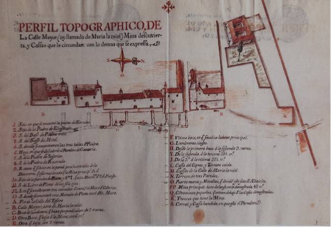 …ocho grandes arañas de cristal que iluminaban toda aquella estancia, de modo que parecía un hermoso agraciado Mongivelo [monte Etna] (…) En el segundo gabinete un peñasco de mármol blanco que sostenían cuatro ninfas con la más gallarda simetría y de su altura cuatro figuras por cuyas bocas brotaba el agua, labradas con tal destreza que parecían vivas (…) tenía por remate el mármol una delicada estatua de Neptuno, con un dorado tridente en la mano pisando unos delfines (…) En las paredes de ambos costados había dos grandes jarrones grandes de jaspe encarnado y por basa de uno de ellos una sirena echando agua (…) unos escudos de armas del dicho mármol blanco, coronados de medallas de piedra negra”.