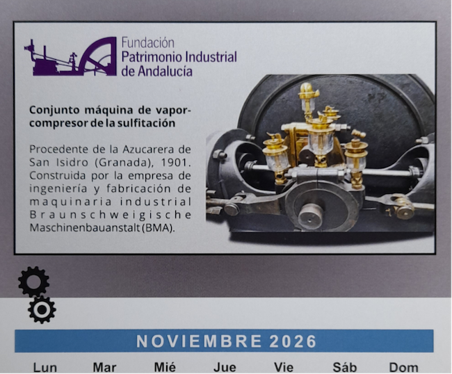 La Fundación del Patrimonio Industrial de Andalucía (FUPIA) dedica este año su calendario de mesa a la colección del ingeniero Miguel Giménez Yanguas. La portada y cada uno de los meses van ilustrados con fotografías de piezas históricas que formaron parte de alguna fábrica de Andalucía, fueron desechadas cuando quedaron obsoletas y Miguel las restauró para dejarlas como el día que fueron fabricadas.