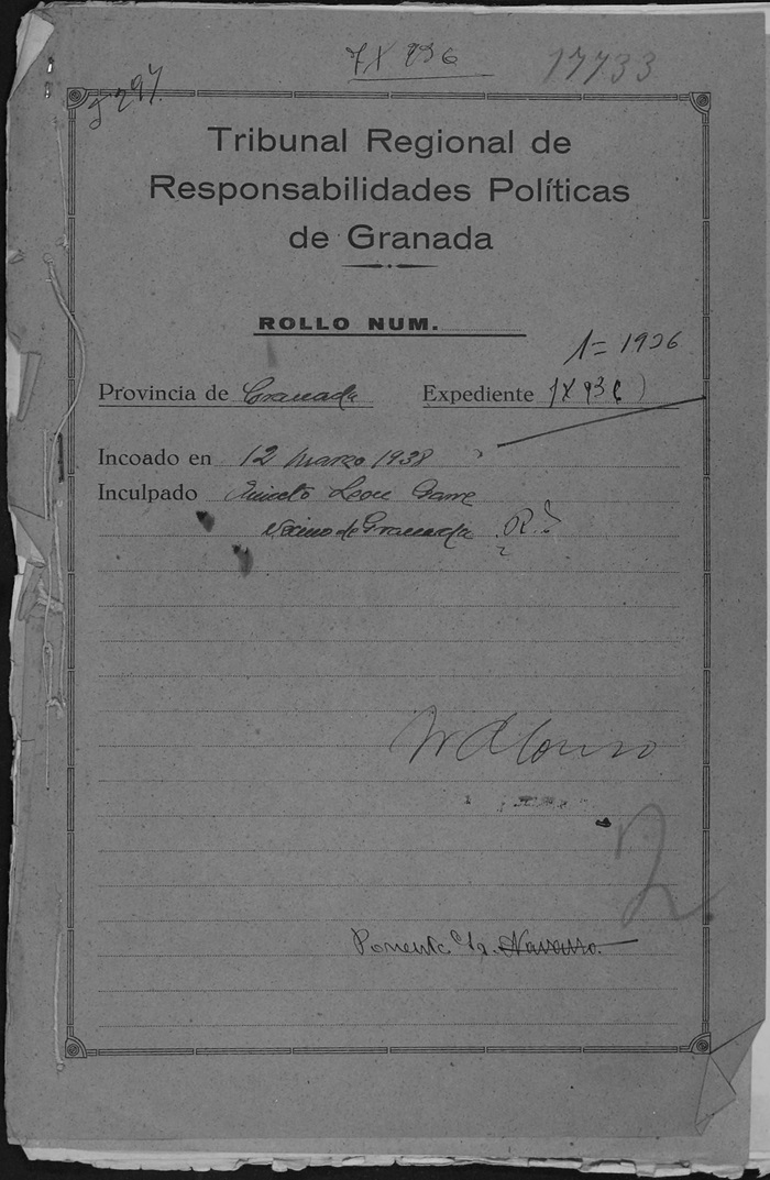El proceso de Responsabilidades Políticas se incoa el 12 de marzo de 1938, según se escribe en la portadilla del expediente. En los informes destinados al Juez Instructor del Juzgado Provincial de Responsabilidades Políticas se da una información sesgada, tergiversada y en ocasiones incorrecta sobre su persona: así en los de la Guardia Civil, 12 de noviembre de 1941 y 29 de febrero de 1942, se dice que es “socialista”, “alentador de las masas para cometer asesinatos” y “desafecto y peligrosísimo para nuestra patria”; en otro de FET de las JONS que fue “nombrado Rector de la Universidad de Granada, desempeñando el cargo en Baza”; su vida privada, conceptuada como “regular”, incluye algunas afirmaciones difamatorias, como era habitual; en lo referente a su religiosidad se le define como “indiferente” y de su vida pública y profesional que “está bien conceptuado en los dos sentidos”, aunque, en su actuación antes del Movimiento, se le acuse de intentar “llevarse a algunos profesores del Instituto del que era Director a afiliarse a IR”. No hay acuerdo sobre su situación económica: unos dicen que es ”bastante desahogada, siéndole intervenido el capital que tenía en el Banco Hispanoamericano, así como sus muebles” (FET de las JONS), otros que carece de bienes (autoridades municipales de Granada y de su pueblo natal, así como la Guardia Civil). Por lo general, se desconoce su paradero exacto. El 24 de febrero de 1942 se da por terminada la instrucción, que le declara insolvente, con sus bienes intervenidos e incurso en los apartados B, C, E, F y N del artículo 4 de la ley de Responsabilidades Políticas (desempeñar cargos, estar afiliado, haberse significado y ser candidato del FP, huir al extranjero) remitiendo el expediente al TRRP. No sabemos si hubo sentencia del TRRP. Habrá que esperar al 1 de junio de 1946 para que la Comisión Liquidadora de Responsabilidades Políticas, desde Madrid, comunique al Juez de Instrucción de Granada el Auto de Sobreseimiento provisional dictado el 17 de julio de 1945 y por tanto se dejen sin efecto las medidas precautorias y se devuelvan los bienes intervenidos.