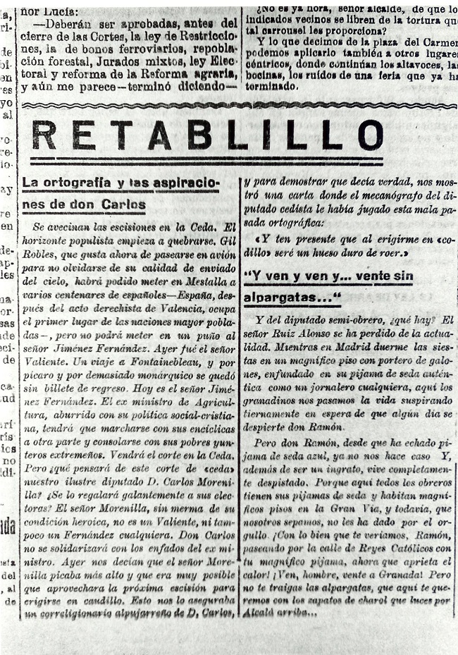 “Y del diputado semi-obrero ¿qué hay? El señor Ruiz Alonso se ha perdido de la actualidad. Mientras en Madrid duerme las siestas en un magnífico piso con portero de galones, enfundado en su pijama de seda auténtica como un jornalero cualquiera, aquí los granadinos nos pasamos la vida suspirando tiernamente en espera de que algún día se despierte don Ramón. Pero don Ramón, desde que ha hecho pijama de seda azul, ya no nos hace caso. Y además de ser ingrato, vive completamente despistado. Porque aquí todos los obreros tienen su pijama de seda y habitan magníficos pisos en la Gran Vía, y todavía, que nosotros sepamos, no les ha dado por el orgullo. ¡Con lo bien que te veríamos Ramón, paseando por la Calle Reyes Católicos con tu magnífico pijama, ahora que aprieta el calor. ¡Ven hombre, vente a Granada! Pero no te traigas las alpargatas, que aquí te queremos con los zapatos de charol que luces por Alcalá arriba. (El Defensor, 4-7-35).