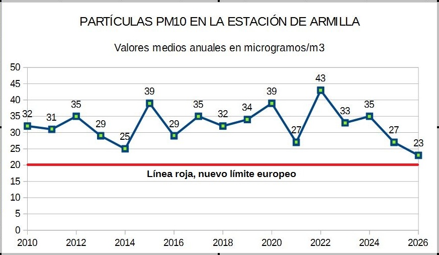 También en partículas en suspensión los valores del lluvioso enero han sido los más bajos registrados. En las partículas PM10, la estación de la ciudad deportiva de Armilla, la que presenta mayores concentraciones de este contaminante, midió un promedio de 23 microgramos/m3, el menor valor desde 2010 en que empezó a recoger datos.