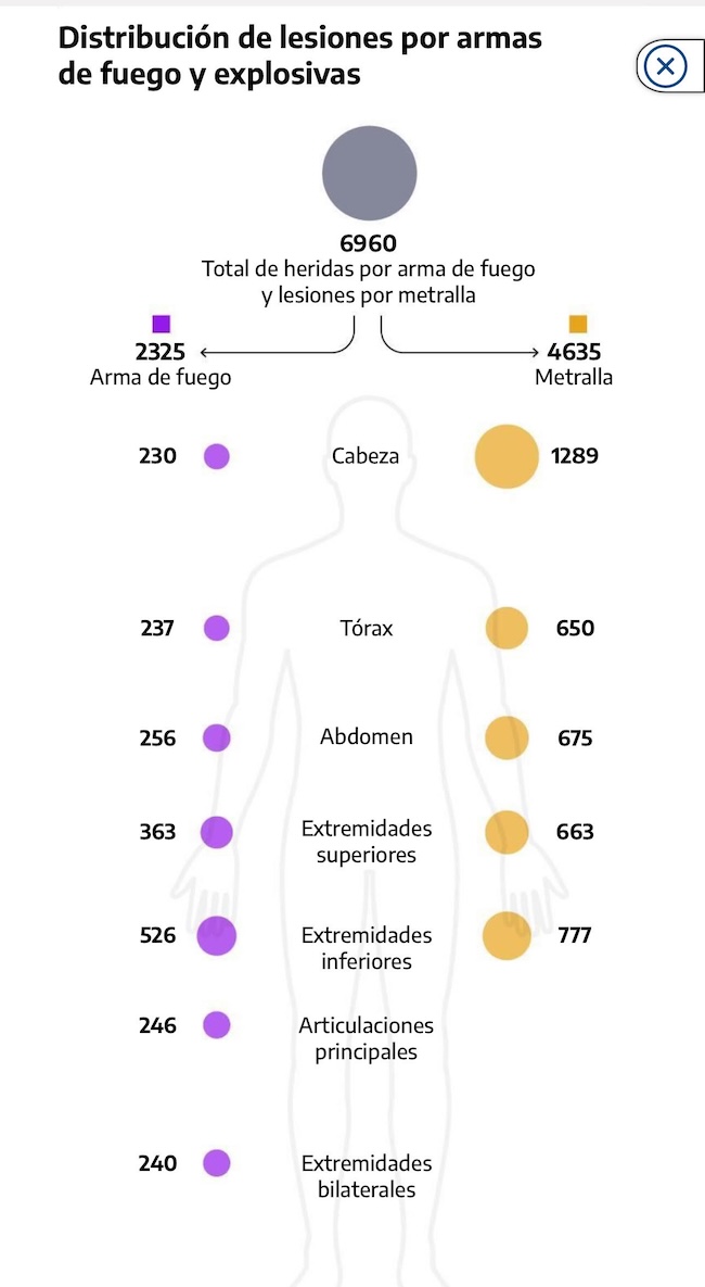 Las lesiones por explosiones representaron la mayoría de los traumatismos relacionados con armas (4.635, 67%), que afectaron predominantemente a la cabeza (1.289, 28%), mientras que las lesiones por armas de fuego afectaron principalmente a las piernas (526, 23%).