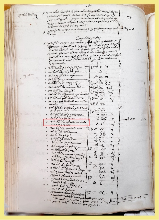 En cuanto al segundo resultado, muy pronto ya (entre los estudiantes de los cursos de 1539 a 1549) empiezan a aparecer en los listados de estudiantes/licenciados los nombres de alumnos que procedían de la grey morisca. Todos ellos habían comenzado sus estudios en el Colegio de San Miguel, después pasaron al grado superior de Artes en el Colegio de Santa Catalina Mártir y consiguieron el título de bachilleres para completar el estudio general. Conocemos los nombres de algunos de ellos porque aparecen reflejados en los primeros libros de cuentas que se conservan de la UGR: fueron el mencionado Castillo (quizás Alonso), Juan Evangelista, Juan de Santa Ana, Alonso de Santo Onofre y Diego de Magdalena. En el listado quizás también deberíamos incluir al negro Juan de Sessa, posterior Juan Latino, aunque su origen y sus circunstancias vitales fueron muy diferentes.