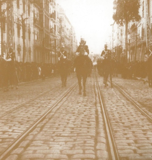 Desfile procesional a finales de los años 20 ó primeros 30 del siglo pasado. Todavía perduraba el adoquinado original en las vías (eliminadas en 1959). A la derecha se ve la silueta del enorme ciprés que había en el huerto del Monasterio de Santa Paula y que cayó en la acera de enfrente al ser cortado su solar por la apertura de la Gran Vía. Este árbol perduró hasta la reforma de 1950.