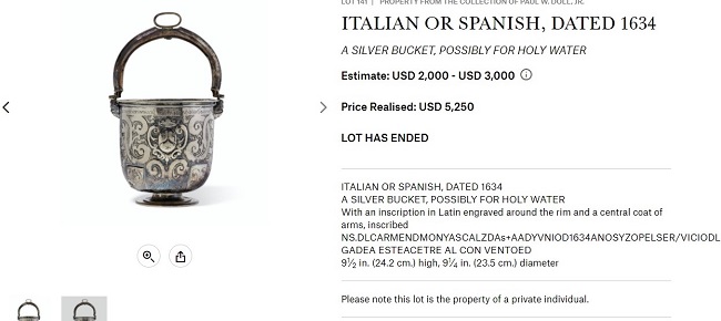 El Museo de las Carmelitas ha recuperado el acetre de plata que subastaba Christie's. Por 4.200 dólares, más otros mil por la comisión que cobra la casa de subastas, la pieza regresará a Granada.
