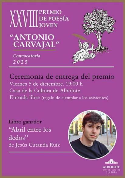 Jesús Cutanda Ruiz recibe este viernes 5 de diciembre en Albolote el Premio de Poesía Joven Antonio Carvajal 2025.