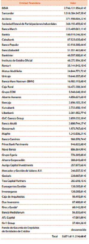 De ellas, 19 bancos y cajas comerciales que mantienen un importante apoyo a la industria armamentística en el siguiente orden de importancia: BBVA, Santander, Banca March, Bankia, Caixabank, Banco Popular, Banco Sabadell,Bankinter, Unicaja, Banco Mare Nostrum (BMN), Caja Rural, Ibercaja, Kutxabank, Liberbank, Banco Alcalá, Banco Caminos, Caja de Arquitectos y Banco Mediolanum. También aparecen tres entidades públicas de inversión: SEPI, ICO y el Fondo de Garantía de Depósitos de Entidades de Crédito. Además de tres empresas de seguros con inversiones en armas: Mutua Madrileña, Mapfre e Inverseguros. Finalmente, son 19 las pequeñas o grandes entidades de inversión de clientes de rentas altas.