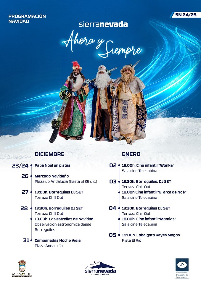 El programa de Navidad en Sierra Nevada empezará el 23 de diciembre con la bajada de Papa Noel por las pistas de Borreguiles saludando a los niños y repartiendo caramelos, también estará al día siguiente, 24 de diciembre.