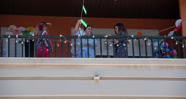 Con banderines y farolillos de papel entre los balcones, mantones y cruces en el interior de las casas, patios y balcones, los motrileños y motrileñas se han animado incluso a vestirse con trajes de flamenca y de corto.