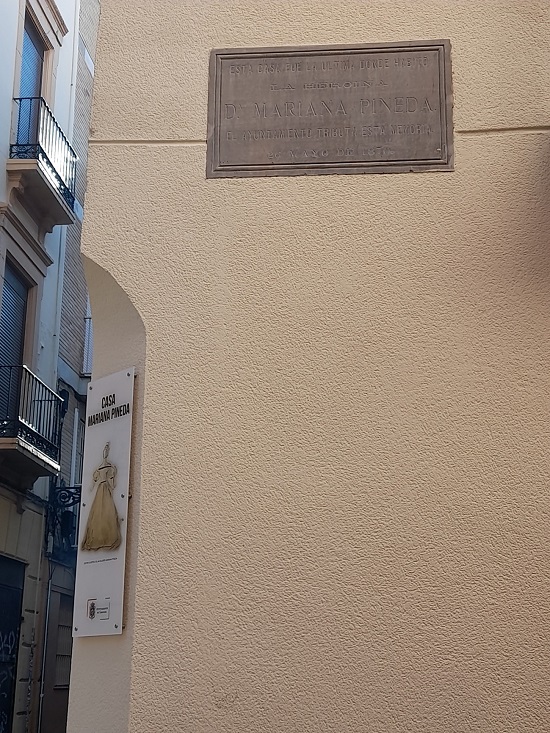 Poco se puede añadir sobre la figura de Mariana Pineda que no esté escrito por Antonina Rodrigo. A la infinidad de homenajes que ha recibido a lo largo de los dos últimos siglos se añadieron estas dos placas en la casa en la que se supone nació, en Carrera del Darro número 9, y la que fue su última residencia, en la calle Águila. En la carrera del Darro es una simple placa, pegada en 2004 con motivo del bicentenario de su nacimiento, en la que dice que era su casa familiar. En cambio, en la calle Águila, 19, no es sólo una placa, sino toda la vivienda la que está dedicada a la heroína liberal ajusticiada en 1831. Alberga desde 2004 el Centro Europeo de Estudios de la Mujer. Además de biblioteca, ofrece un pequeño museo de temática relacionada con Mariana. Aparte de estas placas, también hay que añadir el destacado monumento y la plaza que le honran en la zona céntrica de la ciudad. Los restos mortales de Mariana Pineda están depositados en la cripta de la Catedral.