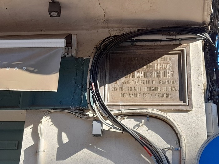 En una esquina de la plaza del mismo nombre, casi disimulada entre el abundante cableado, se puede ver una placa que recuerda la estancia del pintor y anticuario catalán Mariano Fortuny. Ni nació en Granada ni murió aquí, pero reflejó sus paisajes en varias de sus obras. También trapicheó con obras de arte que exportó hacia otros destinos nacionales y extranjeros. El pintor reusense se instaló en la casa donde está la placa durante un breve periodo de 1870-72. También vivió dentro del recinto de la Alhambra, donde nació su hijo Mariano Fortuny Madrazo. El año de su muerte, 1874, el Ayuntamiento le dedicó la placa a tan ilustre pintor por haber dado a conocer el colorido y la luz de la ciudad en sus obras.