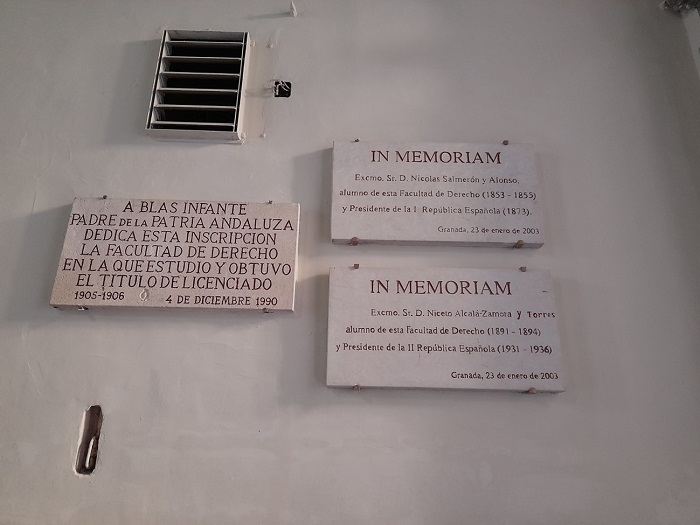 En el Paraninfo de la Universidad fueron colocando a lo largo del siglo XX una serie de placas que recuerdan a estudiantes no granadinos, pero que cursaron aquí estudios y después tuvieron un papel sobresaliente en la historia social y política de España. Aquí podemos ver la de Francisco Giner de los Ríos (fundador de la Institución Libre de Enseñanza), Blas Infante (al que muchos consideran padre de la patria andaluza), Nicolás Salmerón (presidente de la I República), Niceto Alcalá-Zamora (presidente de la II República), etc.
