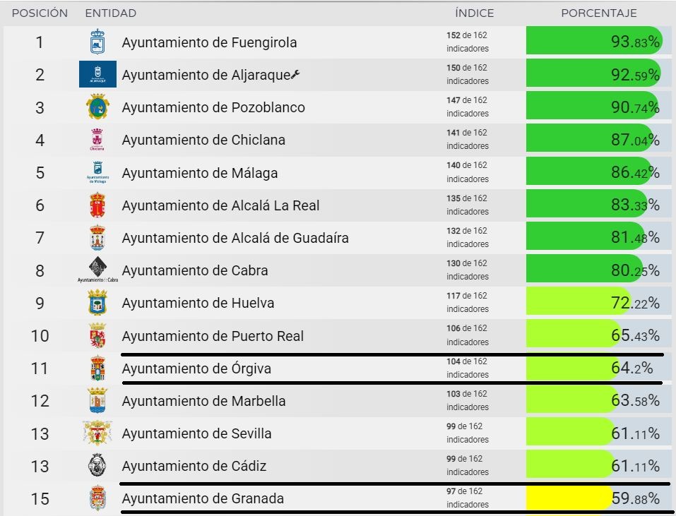 Con estos datos, a nivel provincial Órgiva ocupa el primer lugar en el listado provincial de transparencia, por delante del Ayuntamiento de Granada, en la segunda posición, con un índice de transparencia del 59,88%. Asimismo, el consistorio orgiveño pasa del puesto 58 al 11 a nivel andaluz y del 264 al 82 en el ranking nacional.