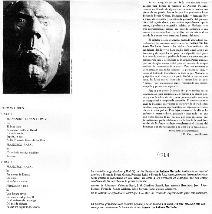 Las ilustraciones que Joan Miró hizo expresamente para el acto nos muestran su relevancia en el mundo de las artes y las letras, con la participación de intelectuales de la talla del pintor catalán. Sólo lo recibió Bernabé, que no sospechaba siquiera que era el PCE el que estaba detrás de todo esto. A esas alturas, el PCE no tiene contactos definidos en la Universidad de Granada, aunque uno de sus integrantes –quizá el único- era el estudiante onubense Emilio Escobar Toscano. Por tanto, ni en la Universidad, ni en el propio PCE de Granada, conocen dicha convocatoria y es lógico porque se circunscribió en muchos lugares a un acto netamente cultural. Esa es la lógica que sirve también para el PCE de Jaén, como explica Ernesto Caballero Castillo, a la sazón miembro del Comité Regional del PCE y encargado de reorganizar a los comunistas en la provincia jiennense en esos momentos. Recuerda que “la organización del PCE en Jaén no tuvimos conocimiento del homenaje a Machado hasta el día después que escuchamos la Pirenaica. De haber estado informados la organización del Partido habría movilizado a un buen número de personas de la provincia, pues tenía presencia orgánica para haberlo hecho”. En todo caso, la iniciativa de Granada partirá de Bernabé López que, entusiasmado por la figura del poeta, colocaría el cartel de Miró en la Facultad de Filosofía y algunos estudiantes, en idéntico estado de ánimo, publicitaron el acto entre compañeros y profesores de la Facultad. Juan de Loxa y el propio Bernabé organizaron el viaje a Baeza en el entorno de la Universidad de Granada y concertaron un autobús con la empresa Liñán, que salió completo desde la plaza del Campillo ese mismo 20 de febrero de 1966. En él viajaban los hermanos Moreno Carrillo, Carmelo y Claudio Sánchez Muros, Pablo del Águila, Juan de Loxa y media familia de Bernabé López García, entre otros.