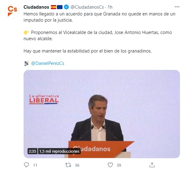La injerencia desde Madrid, sin conocer realmente lo que está pasando en Granada es de tal calibre, que hasta Daniel Pérez Calvo hablaba de José Antonio Huertas como vicealcalde de Granada, cargo que no existe en el Ayuntamiento granadino, y, desde el pasado viernes es alcalde en funciones, con el único cometido de convocar el pleno de investidura del miércoles