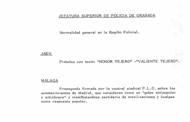 Hay dos hechos que a continuación menciona. De un lado, da cuenta de la aparición de pintadas en Jaén con el siguiente texto: "HONOR TEJERO" y "VALIENTE TEJERO" y, de otro, el reparto en Málaga de propaganda sindical de P.L.O. sobre los acontecimientos de Madrid, que considera un "golpe antipopular" y antiobrero", manifestándose partidaria de manifestaciones y huelgas como respuesta popular.