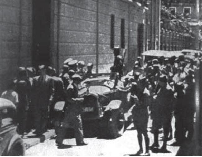 Entrada principal del edificio del antiguo gobierno civil, el 20 de julio de 1936. A sus puertas se agolpaban militares y voluntarios, donde conducían a los detenidos tras el golpe de estado. Fuente: Joaquín Gil Honduvilla, Y cayó Granada. La sublevación de julio de 1936 en la capital y la provincia, Comares, Granada, 2019, pág. 168.