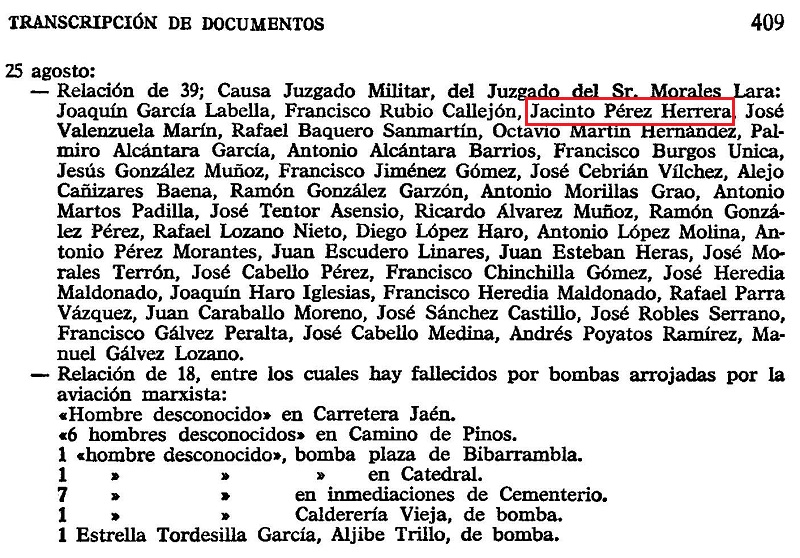 Así lo atestigua en su página 409 la obra Los últimos días de García Lorca, de Eduardo Molina Fajardo, que transcribió, de forma clandestina, los documentos de registro de fusilados obrantes en el cementerio. Los cuales desaparecieron igual que los seres humanos inscritos en ellos, con la abyecta intención de eliminar no solo sus vidas, sino también su memoria.