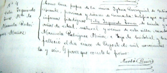 Su fallecimiento se encuentra inscrito fuera de plazo, el día 31 de Julio de 1943, en el Registro Civil de Las Gabias, al Tomo 31, Folio 70 vto., nº 32, constando como causa de su muerte “heridas sufridas por metralla”.