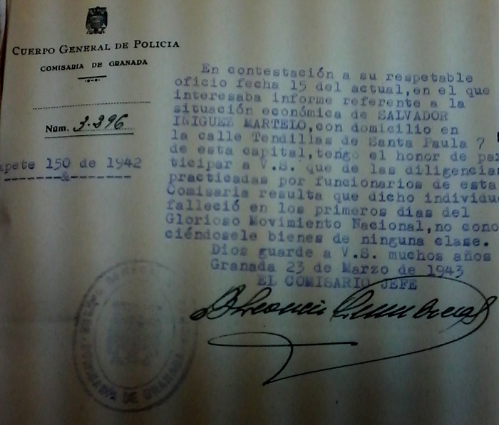 No. Salvador Íñiguez solo cometió el delito de defender, desde su fe cristiana, desde su palabra en sus conferencias, valores sociales de igualdad, apostando por los más desfavorecidos, defendiendo la II República y desenmascarando a los privilegiados de todos los tiempos. Y eso lo hacía desde, como él mismo escribía, “la espada de la fe” y el “escudo de la razón”, las únicas armas que podían alumbrar esa nueva sociedad en la que creía. Pero, aunque lo volvieron a difamar en esos informes, no solo para quitarle la vida –eso ya lo habían hecho-, sino para seguir castigando a la familia embargándole sus bienes, que no tenían, al final, como en la inmensa mayoría de los casos, las autoridades confirman que no posee bienes y el 22 de mayo de 1943 se dictó Auto de sobreseimiento y se archivó su expediente. (Archivo Real Chancillería de Granada, Caja 25989, Pieza 51 y Caja 25883, Pieza 10).