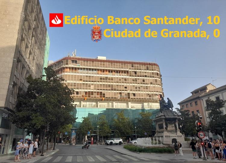 3. El Banco de Santander, como sus vecinos de manzana, promovió la obra que le permitieron desde el Ayuntamiento. Fijó sus pretensiones en máximos y casi los consiguió, pues sólo le exigieron rebajar una planta y dos torretas. No perseguía sólo contribuir con su sede a engrandecer el urbanismo granadino; el fin último fue dar un gran pelotazo urbanístico. Un verdadero gol a la ciudad por las dos escuadras.