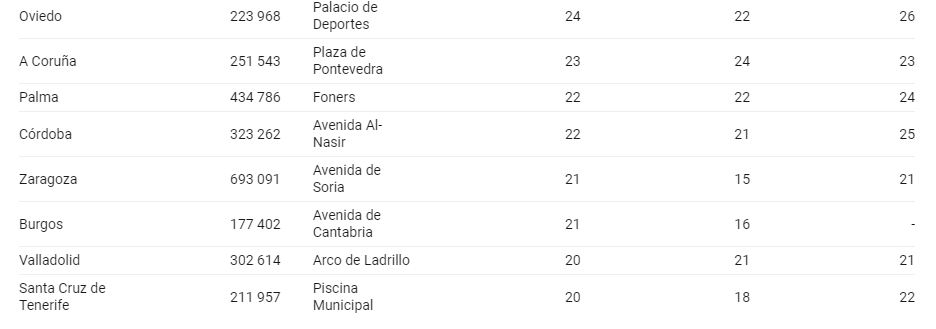 Otras trece ciudades analizadas también han superado durante el año pasado el nuevo límite legal de NO2, destacando las estaciones Felisa Munárriz en Pamplona (27), Olivereta de València (26), Torneo en Sevilla (25), María Díaz de Haro en Bilbao (25), Oeste en Vigo (25), Palacio de Deportes en Oviedo (24) y Plaza de Pontevedra en A Coruña (23). Las ciudades que registraron concentraciones de NO2 más bajas fueron Palma (Foners, 22), Córdoba (Avenida Al-Nasir, 22), Zaragoza (Avenida de Soria, 21), Burgos (Avenida de Cantabria, 21), Valladolid (Arco de Ladrillo, 20) y Santa Cruz de Tenerife (Piscina Municipal, 20), las dos últimas sólo unas décimas por encima del nuevo límite legal a cumplir en 2030.