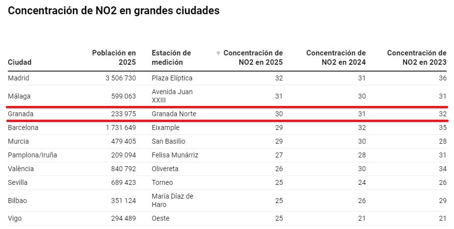 Granada ha sido en 2025 la tercera ciudad española con mayores niveles de polución por dióxido de nitrógeno (NO2), contaminanate que proviene fundamentalmente del tráfico, según los datos provisionales recopilados por Ecologistas en Acción de las estaciones oficiales de control de la calidad del aire de una veintena de ciudades españolas medias y grandes, que suman casi 12 millones de habitantes y una cuarta parte de la población española.