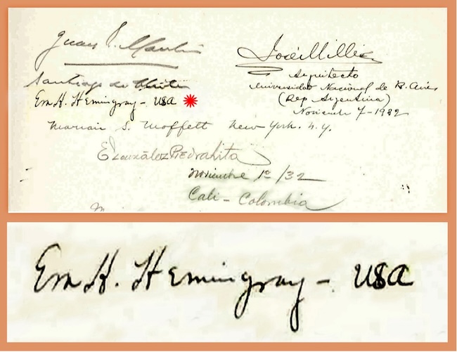 Se trata de una firma con trazos menos rotundos que otras conservadas en sus dedicatorias de libros o documentos oficiales. Letra pequeña, como queriendo pasar desapercibido. O estando un poco beodo. Solamente escribió su nombre y su procedencia: Ernst Hemingway-USA.
