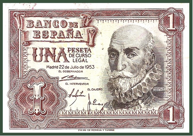 Billete de una peseta cuya efigie de Álvaro de Bazán es el modelo elegido para la cabeza de la estatua granadina.