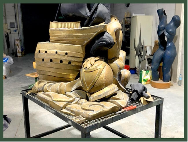 Los hermanos Moreno ya tienen montada en chapa toda la peana de olas y el armazón del galeón; se disponen a modelar las velas que trepan por las piernas.