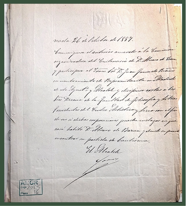 Carta enviada por el alcalde Eduardo Gómez Ruiz a instituciones e intelectuales pidiéndoles que buscaran la partida de nacimiento de Álvaro de Bazán e indagaran el sitio dónde, supuestamente, había nacido en Granada. AHMGR.